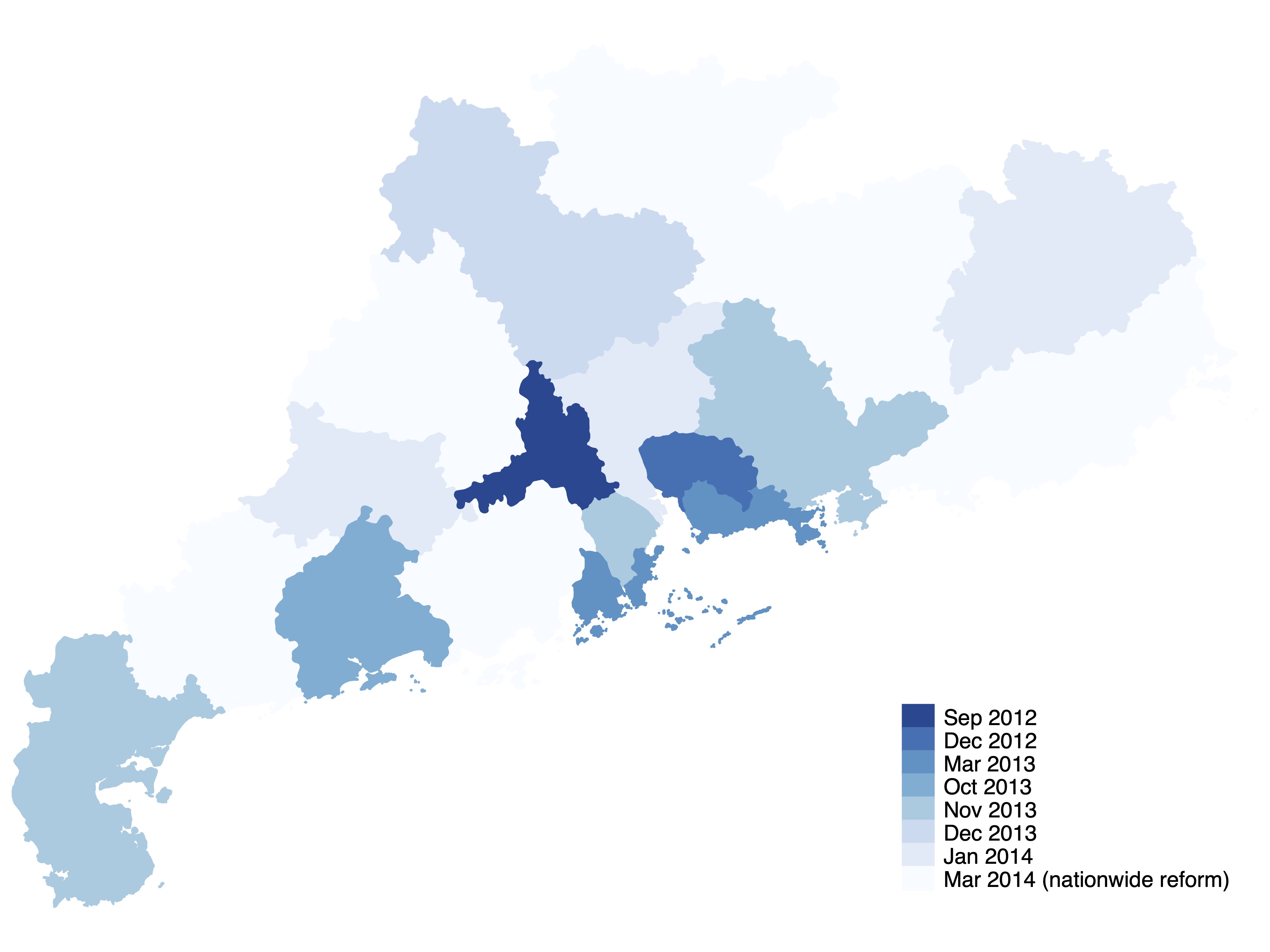 Before implementing the reform nationwide, the government conducted a staggered pilot programme across cities in Guangdong. Guangdong, a coastal province in southern China with 21 cities, is China’s most populous and wealthiest province. The pilot was initiated in 2012 in Dongguan and Foshan and sequentially adopted by ten other cities in 2013 and early 2014. In March 2014, the reform expanded to include the remaining nine cities in Guangdong and the rest of China. The timing of the pilot’s rollout is summarised in Figure 1, with darker colours representing cities that implemented it earlier.