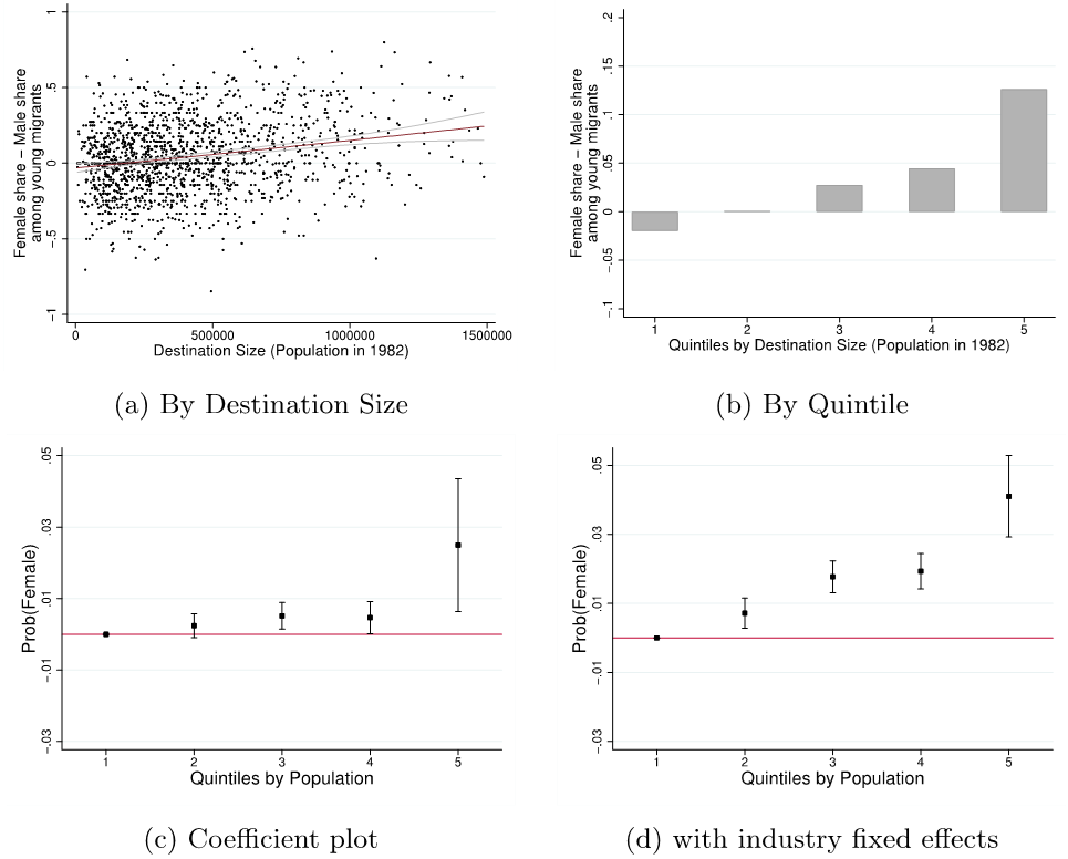 This pattern is not confined to a single city in China; it is observed nationwide. Panels (a) and (b) in Figure 2 show that the surplus of young females among migrants is more prominent in larger destinations. As a result, the overall gender imbalance among young individuals tends to increase with city size, as shown in panel (c). This pattern persists even after controlling industry fixed effects, as shown in panel (d).