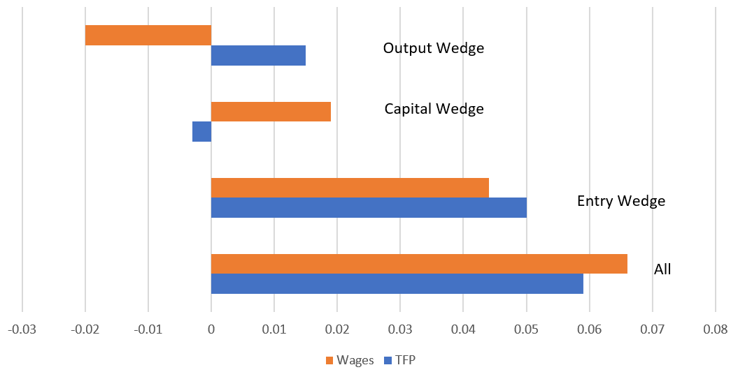 Notes: The figure illustrates the contribution of entry barriers and output and capital wedges to the regional convergence in wages and TFP between 1995-2008. We exclude from the figure several other factors, including the regional labor share, the share of the NSOE sector, and the relative supply of workers and entrepreneurs, which have negligible effects.