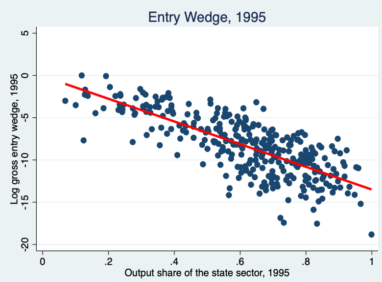 We link the size of these entry barriers and their changes to the size of China’s state-owned enterprise (SOE) sector. In the mid-1990s, SOEs were the source of more than half of industrial output, but there were significant differences between localities. Figure 3 shows the relationship between the entry wedges, which reflect the probability that an entrepreneur will be able to operate a firm, and the size of the state in the mid-1990s: probabilities of operating a firm were sizably smaller in localities with a larger SOE presence, demonstrating that entry barriers were sizably larger in these places.