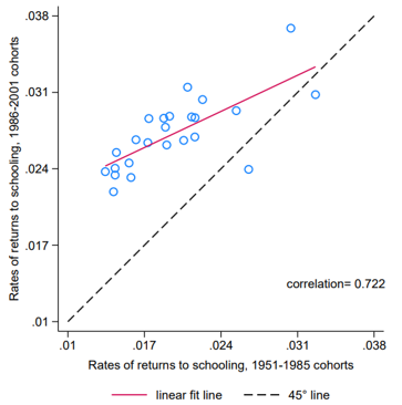 Figure 3. Rates of Returns to Schooling for 1951-1985 and 1986-2001 Cohorts