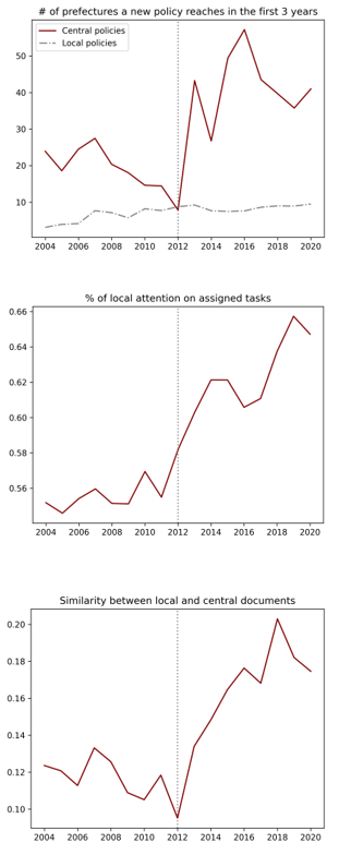 Figure 2: This figure illustrates the increasing centralization of policymaking after 2013. In panel A, we focus on central-government initiated policies, and plot the number of prefectures adopting the policy in the first three years by year of policy initiation. Panel B shows the annual trend in local governments' attention to centrally assigned tasks. For each locality-year, we calculate the share of implemented policies promoted by the central government beforehand, and then average this measure across all localities within the same year. In panel C, we compute the average textual similarity between the first central document on a certain topic and local follow-ups with TF-IDF algorithm, cosine similarity, and standard stop-word removal.
