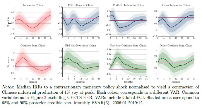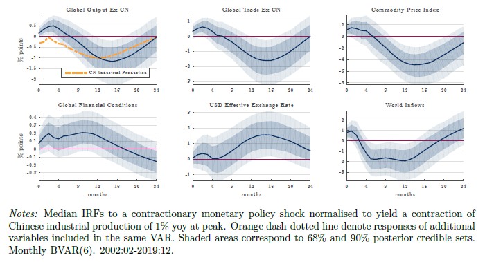 Chinese monetary policy shocks generate large international spillovers (Figure 4). A Chinese monetary tightening triggers a large and persistent contraction in global output excluding China, comparable in magnitude—though delayed—to the domestic effect. Global trade falls sharply, and commodity prices decline significantly and persistently.