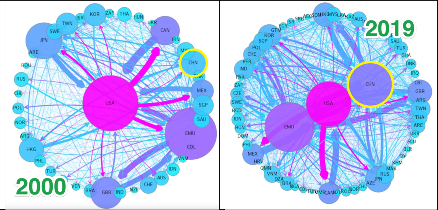 Notes: Directed network of bilateral goods exports, as reported in the IMF Direction of Trade Statistics (DOTS). Mirror data is used to fill missing bilateral trade whenever available. Economic and Monetary Union (EMU) trade with non-EMU countries only is consolidated into a single node. The node size is scaled to reflect the sum of each country’s gross external trade as a share of world total trade (gross exports and imports). We focus only on nodes that have either total exports or total imports of at least USD 10 billion. The edge width also captures the value of gross trade between each pair of countries (nodes) and is normalized between 0 and 20. For comparability, the USA node is positioned in the center of the graph. Position of the remaining nodes is determined using the Fruchterman-Reingold force-directed algorithm, implemented through the Python NetworkX package. The color scale reflects the eigenvector centrality of each country in the network, ranging from magenta for the most central node (USA), through purple for other nodes with high centrality (e.g. EMU, CHN in 2019) and dark blue for less central nodes (e.g., TWN), to cyan for the many peripheral nodes.