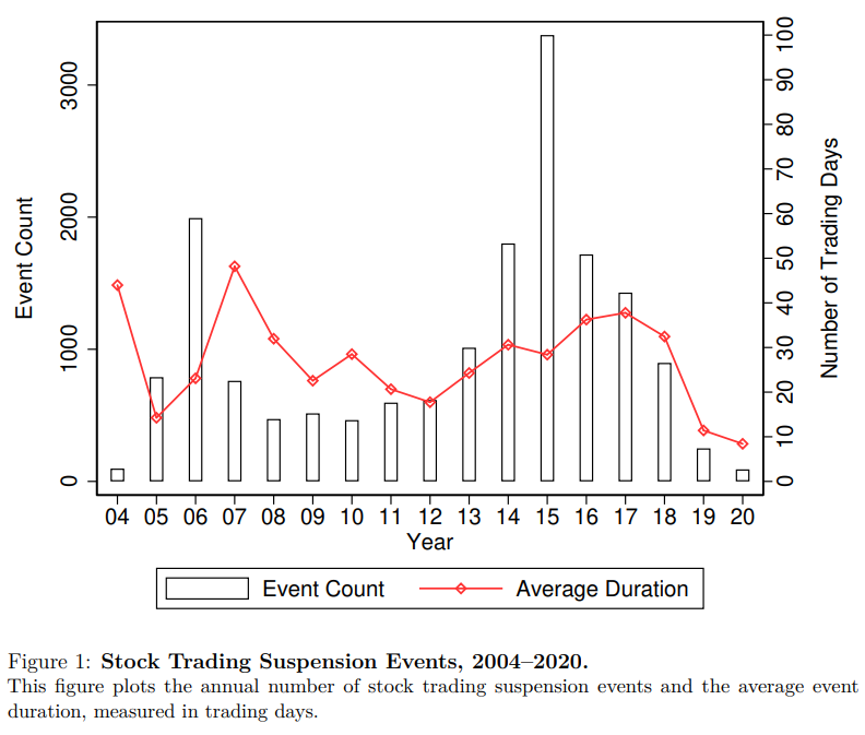 Trading suspensions on individual securities are a pervasive institutional feature of many emerging markets, particularly in China. The two exchanges, the Shanghai Stock Exchange and the Shenzhen Stock Exchange, both allow publicly listed firms to suspend trading before major corporate events. Firms may request suspensions when planning major events such as asset acquisitions, mergers, and restructurings. Historically, these requests were often granted with limited regulatory scrutiny. Between 2004 and 2020, there were 16,958 multiday trading suspensions, affecting nearly 80% of public firms at least once. At any point in time, on average 4.6% of stocks were suspended. As Figure 1 shows, typically 500–2,000 suspensions occur per year, with durations ranging from 30 to 50 trading days, though some persist for many months. Despite the prevalence of these prolonged trading interruptions and frequent media coverage, relatively little is known about how investors respond to them, or what these responses imply for broader theories of information, liquidity, and financial intermediation.