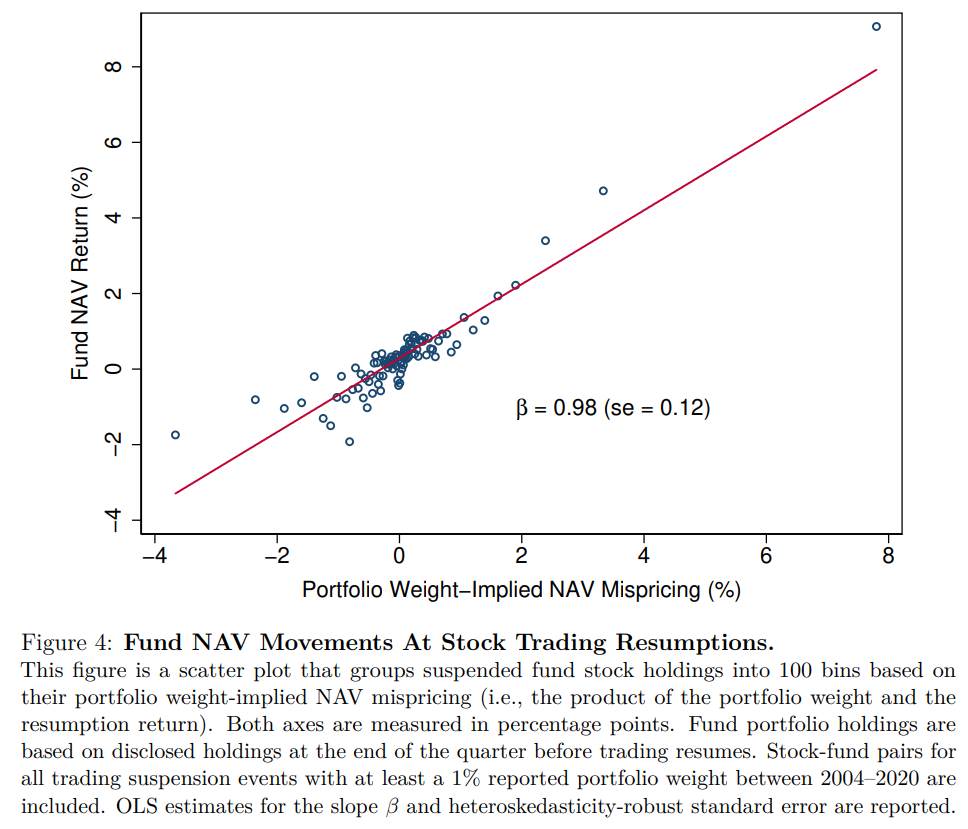 Our study documents that mutual funds frequently hold large positions in suspended stocks, and these illiquid holdings lead to pervasive and significant NAV mispricing. Fund companies often fail to adequately adjust their valuations for suspended stocks, so the fund’s reported NAV drifts away from the stock’s fundamental value during the suspension. Once stock trading resumes, the fund’s NAV experiences a correction as the previously stale-priced stock holding is marked to market. Figure 4 plots the fund’s NAV return at resumption against the suspended stock’s portfolio weight-implied mispricing. There is an almost one-for-one relationship between the weight-implied mispricing and the actual fund NAV return, indicating a predictable NAV correction when trading resumes. The mutual fund’s liquidity thus allows investors to exploit this mispricing using firm-specific information.