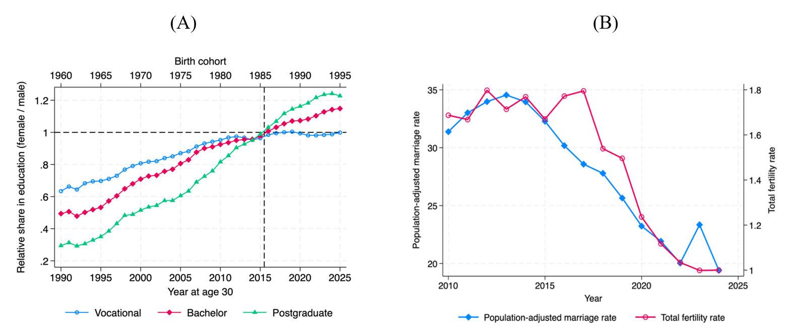 Figure 1A illustrates this reversal. For cohorts born after the mid-1980s, women surpass men at all postsecondary education levels. These cohorts entered the labor and marriage markets around 2010–2015, when China’s marriage rate began to decline more steeply and was followed by a declining fertility rate (Figure 1B).
