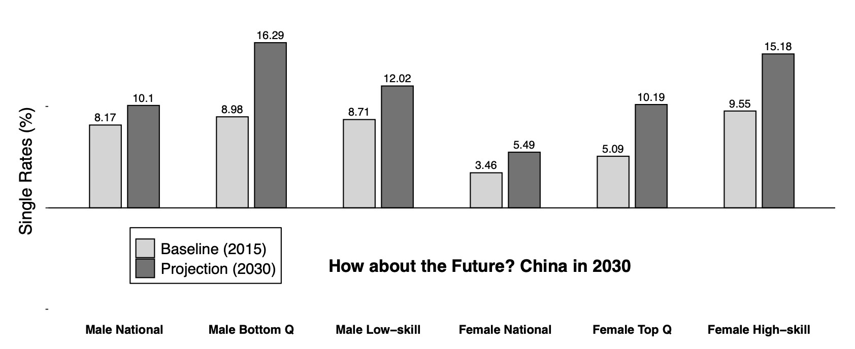 Notes: This figure plots the single rate for each gender under different scenarios. “Baseline (2015)” presents the equilibrium outcomes in the real world for 2015. “Projection (2030)” shows the counterfactual in which the gender-specificities in education, sectoral, and spatial-sectoral allocation costs are projected into 2030 based on the trends between 2000 and 2015. “Bottom Q” and “Top Q” represent prefecture quartiles by GDP per capita.