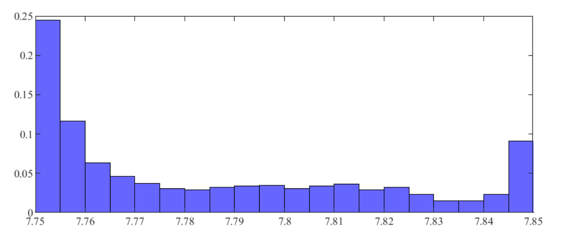 Figure 1. Empirical distribution of the daily USD-HKD exchange rate, January 2007–July 2025. The U-shaped pattern—with probability mass concentrated near the 7.75 and 7.85 convertibility limits—is fundamentally inconsistent with the bell-shaped distribution assumed by Black-Scholes-based approaches.