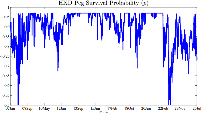 We build a target-zone option-pricing model with an endogenous break probability for Hong Kong’s Linked Exchange Rate System. Using daily spot exchange rates and derivatives prices, we estimate a peg-survival probability p and an implied fundamental value of V for HKD under an alternative regime. The results help interpret episodes like the summer of 2025 and show how rates, liquidity, and renminbi movements shape market perceptions, providing a practical monitoring lens for policymakers and market participants.