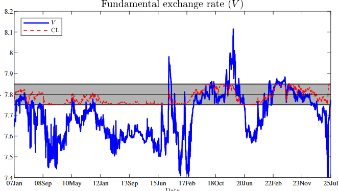 The framework offers a practical way to summarize how financial markets are pricing risks around the LERS on a day-to-day basis. Because it is estimated from foreign exchange derivatives prices, it produces a daily market-based indicator of the peg credibility even when the spot rate remains inside the convertibility zone. The model’s estimates also speak to how markets think about the longer-run monetary environment. In particular, the inferred “fundamental” value V tends to co-move with CNY and CNH, which is consistent with the view that if the regime were ever to evolve the market’s focal point would be some form of managed link to the renminbi rather than a pure free float.