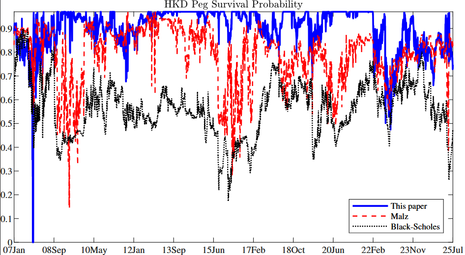 Figure 3. Estimated probability that the USD-HKD exchange rate remains within the convertibility band: Jermann, Wei, and Yue (2025) model (solid blue); Malz (1997) risk-neutral density method (dashed red); standard Black-Scholes (dotted black). Source: Jermann, Wei, and Yue (2025).