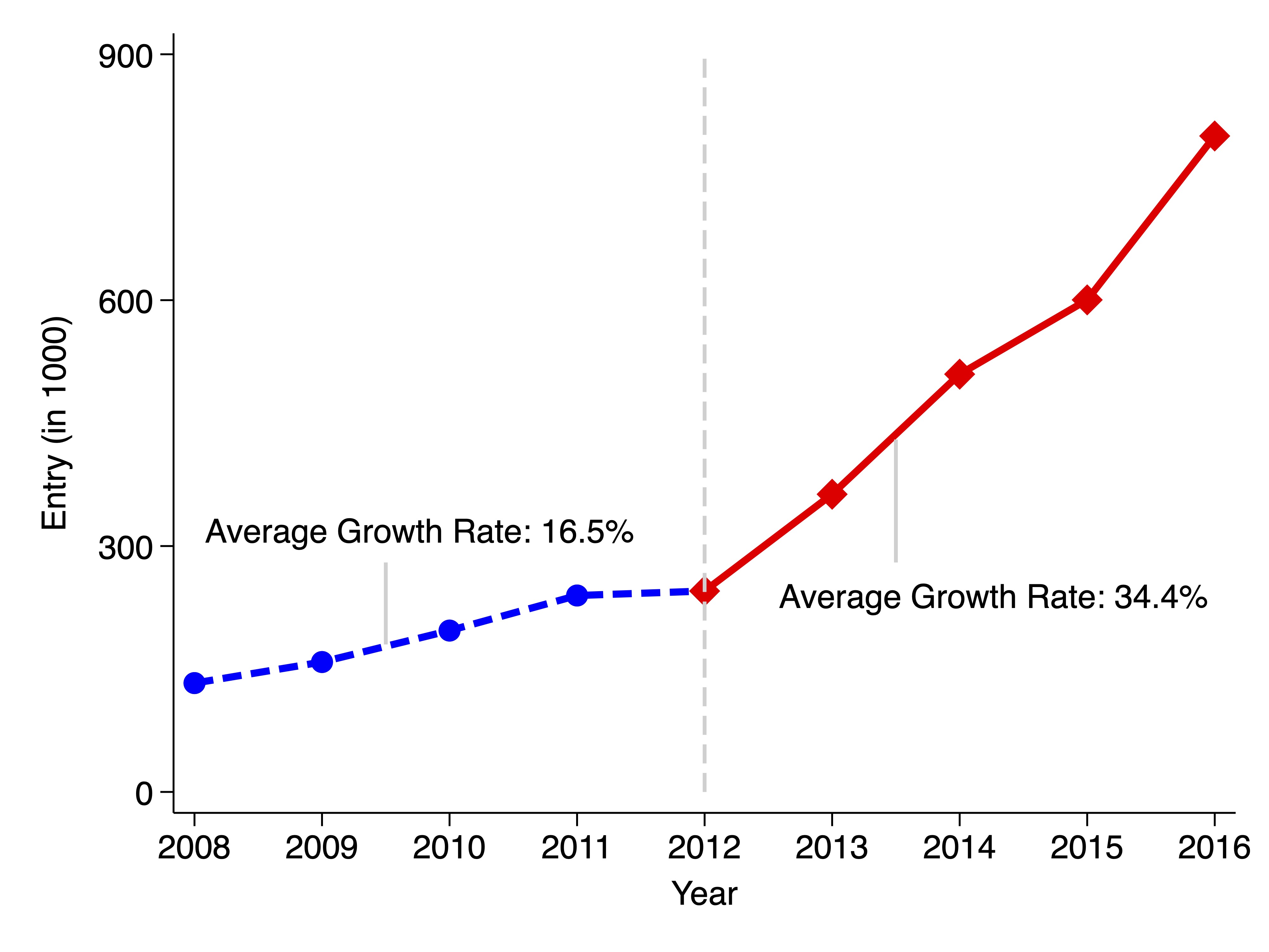 We first examine how the reform affected firm entry using firm registration records. In the wake of the reform, the number of new entrants sharply increased, as shown in Figure 2. The number of new entrants in 2014 was nearly double that in 2012, and the number in 2016 was nearly triple.