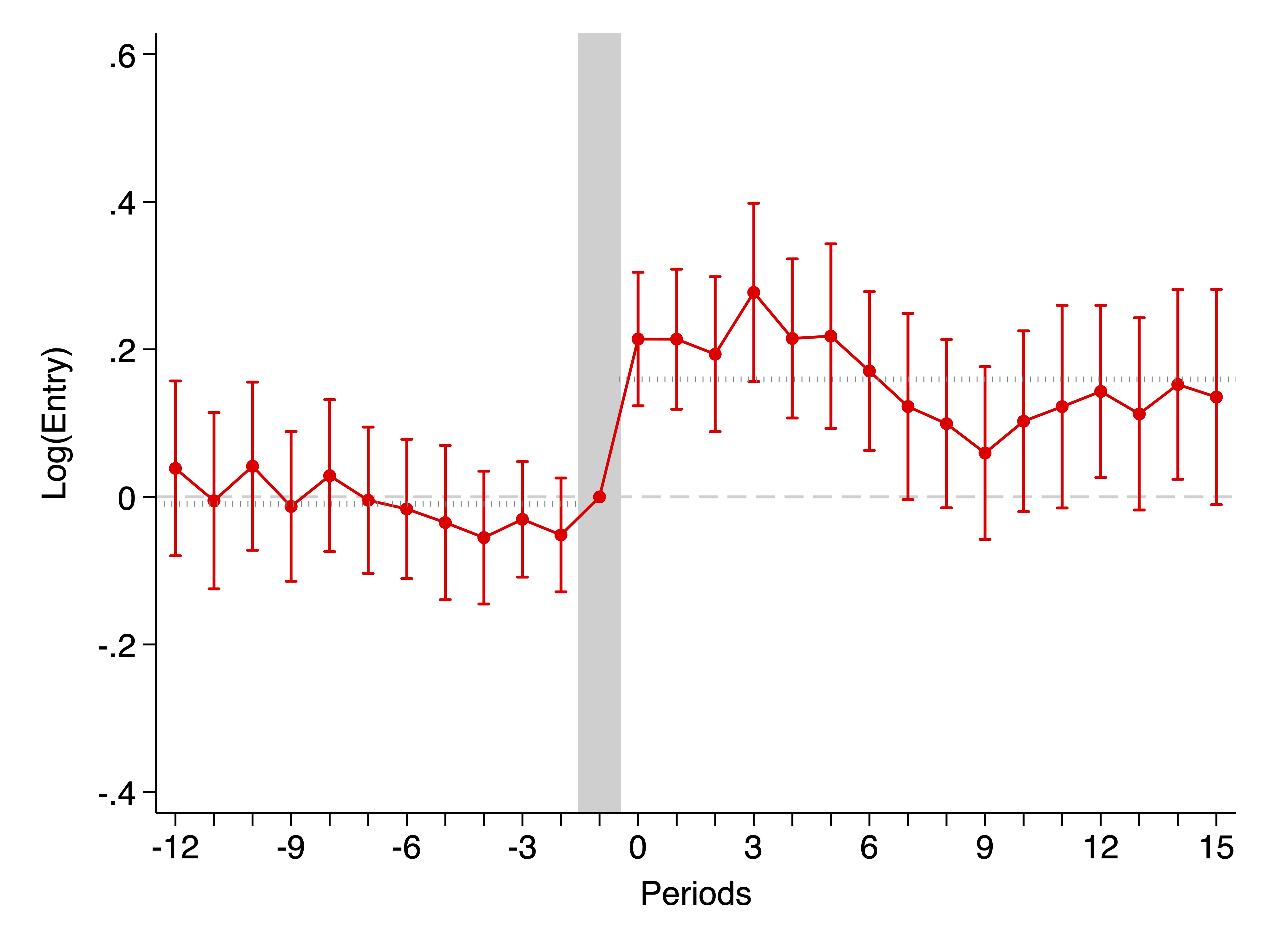 Exploiting the staggered rollout of the pilot programme and an event study framework, we find that China's entry deregulation increased firm entry by 25%. The effect persists over time and is much larger than previous estimates from other countries (Kaplan et al. 2011, Branstetter et al. 2014). The differences are likely due to China’s more comprehensive reform measures – which greatly simplified registration procedures and reduced financial barriers – as well as its rapid implementation and rigorous enforcement (Wei and Sanchez Ortega 2022).