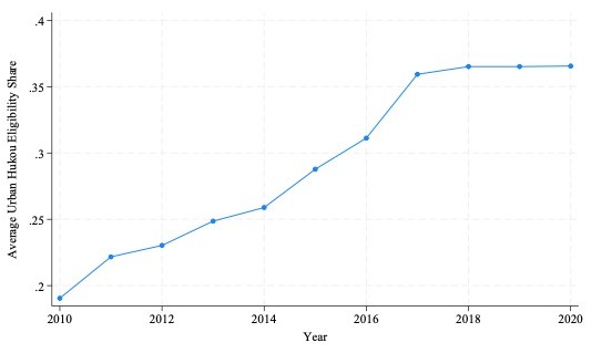 Notes: This figure plots the share of rural origins’ working-age populations, fixed in 2010, who are eligible for urban Hukou registration, averaged across bilateral pairs over time.