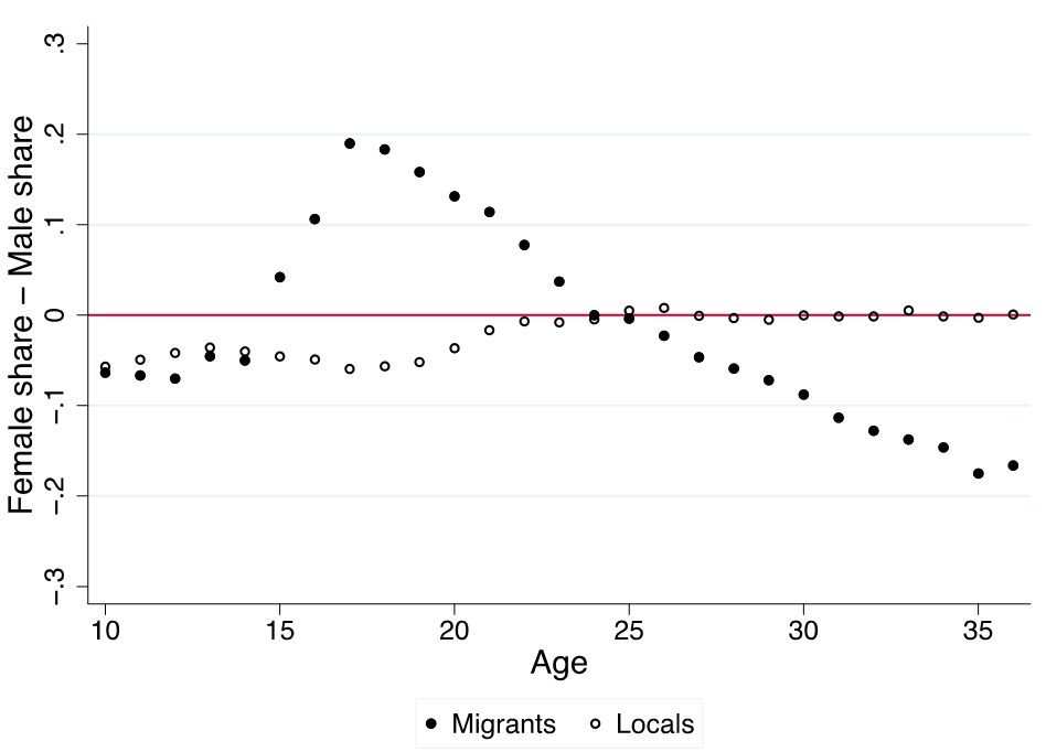 Figure 1. Gender disparity by age for migrants and locals in China in 2000