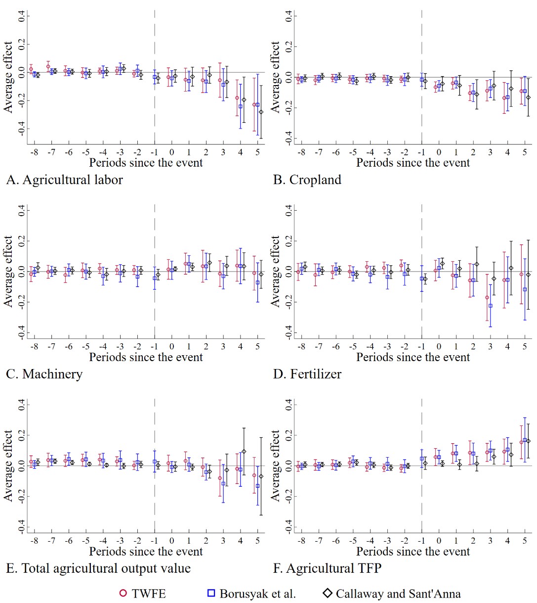 In our study (Chen et al. 2026), we address this puzzle by examining how access to HSR affects agricultural development in rural China. To establish causation, we exploit the staggered rollout of HSR stations across locations as a quasi-natural experiment. Using county-level and household-level data, we estimate a staggered difference-in-differences approach that uses unconnected rural counties as the control group and defines treatment cohorts based on the year of HSR station opening. Figure 1 summarizes the dynamic effects of HSR connectivity. After gaining HSR access, rural counties experience significant reductions in agricultural labor and cropland (Panels A and B), especially in underdeveloped regions characterized by low GDP, inadequate transport infrastructure, and heavy reliance on agriculture. Despite these declines in inputs, however, we find no evidence that HSR access reduces total agricultural output (Panel E).