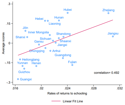 The returns are highly correlated (0.49) with cognitive skill test scores calculated for rural residents of the same age group from the 2014 China Family Panel Studies (Figure 4), suggesting a close association between the returns and the human capital level. We relate the provincial rates of return to provincial inputs for rural schools during the time when the migrant workers of the younger cohort attended school. Returns are associated with items that may characterize aspects of the province’s historic support for schools, such as the number of books per student or the area of school buildings per student, but are not associated with current school spending measures.