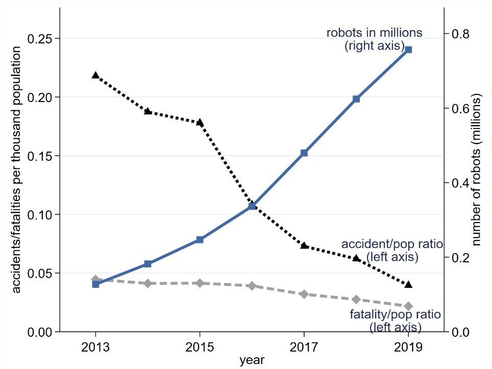 Note: This figure plots the annual number of accidents and fatalities per thousand population (left axis) and the total number of robots in millions (right axis) from 2013 to 2019. Data sources: International Federation of Robotics and local municipal statistical bulletins.