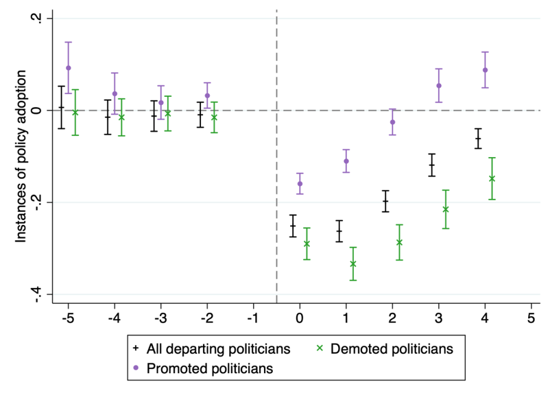 Figure 1: This figure presents event‐study estimates illustrating the decrease in policy adoptions after prefectural party‐secretary departure. Specifically, we run a policy-year level regression with two-way fixed effects, focusing on instances of adoption $\pm 5$ years around the departure of the politician who initiated the policy. We cluster standard errors at the policy level and compare baseline estimates with cases where the departing politicians got promoted or demoted.