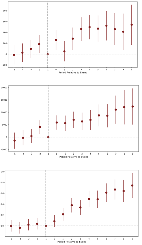 Figure 3: This figure illustrates how policy effectiveness varies with \textit{ex ante} local suitability, based on a triple-difference strategy. We define the treatment as the implementation of any industrial policy in prefecture $p$ during year $t$ targeting industry $i$. We include dummy variables for five lead periods and 10 lag periods relative to that treatment, as well as their interactions with policy-locality suitability (constructed using supply-chain). We report the estimated coefficients and standard errors before the interaction term. Prefecture-by-year, prefecture-by-industry, and industry-by-year fixed effects are controlled in each regression. Standard errors are clustered at the prefecture level.