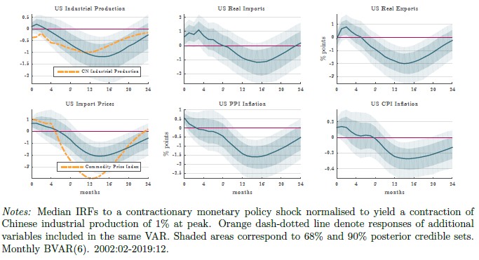 As China’s largest trading partner during our sample, the US is directly exposed to these spillovers (Figure 5). US industrial production contracts following a Chinese monetary tightening, driven by a sharp decline in exports, and to a similar degree as Chinese domestic production. Price spillovers are particularly striking: despite the dollar appreciation, falling commodity prices pass through to US import, producer, and consumer prices.