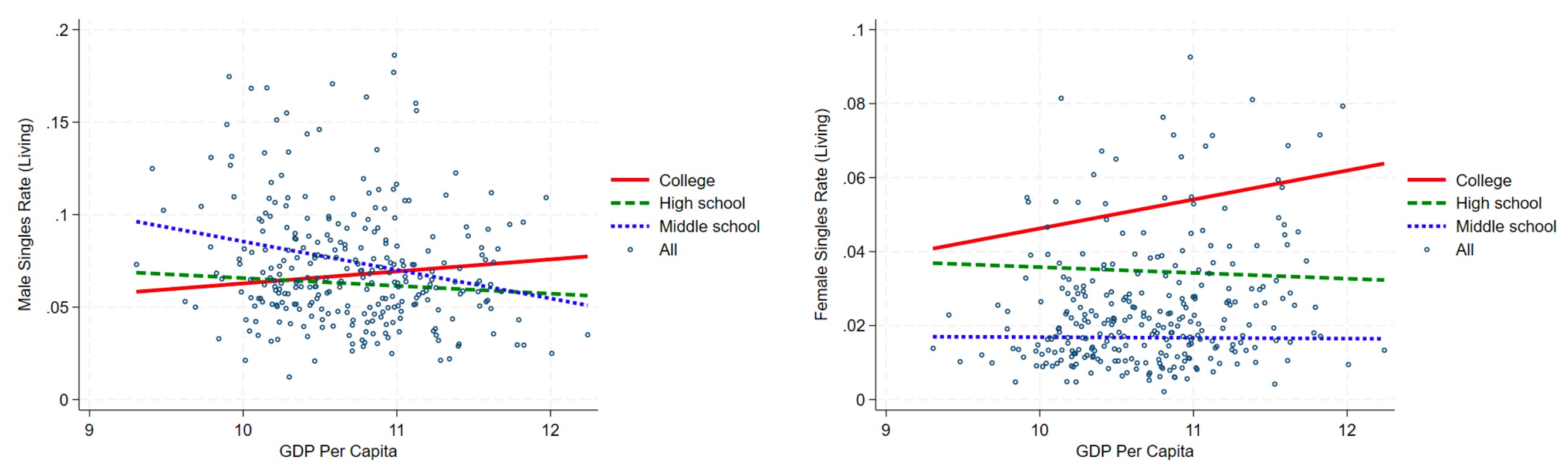 Figure 2 plots singles rates by gender and education levels against city development levels. In more developed cities, female singles rates—especially among college-educated women—are substantially higher. In less developed regions, male singles rates are higher, particularly among low-skilled men.