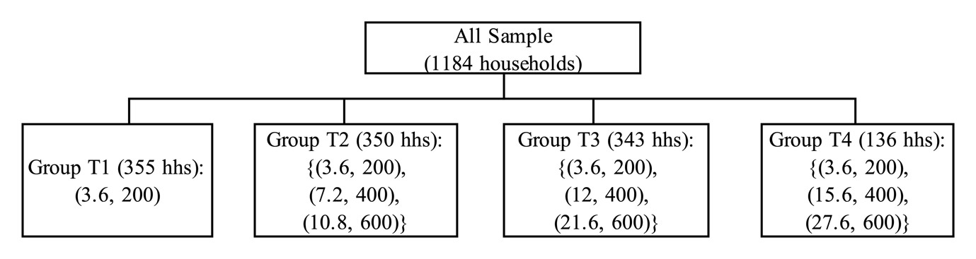 2. Contract menu (Groups T2–T4): Farmers were offered a menu of three contracts that differed in premiums and payouts. The menu included a basic contract with the lowest premium and payout, a moderate-coverage contract (maximum payout 400 RMB), and a high-coverage contract (maximum payout 600 RMB). Within this menu, we experimentally varied the relative prices across contracts, generating different menu configurations.
